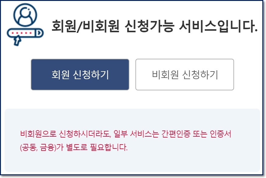 정부24 홈페이지는 회원 또는 비회원으로 모두 이용가능한 서비스입니다. 비회원으로 접속할 시, 개인정보와 인증과정을 거쳐서 사용가능하지만 매번 접속할 때마다 이 과정을 반복해야 합니다. 그래서 저는 이번에 회원으로 가입해서 다음번에 더 쉽게 이용하는 것을 추천합니다.