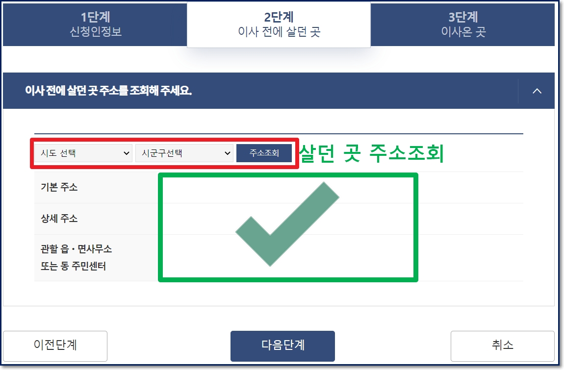온라인 전입신고를 하려면 이전에 살던 곳의 주소정보도 입력해야 합니다. 2단계로 진행되는 신청서 작성 부분은 기존에 거주하던 곳의 주소를 정확히 입력하고 정보를 제공해야 합니다.