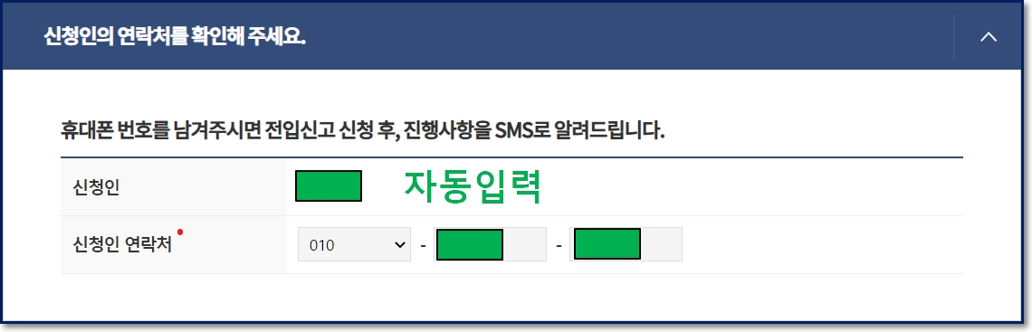 회원 로그인을 하고 신청을 한다면 아래의 녹색 블럭에 있는 부분은 자동으로 입력되어 나타납니다. 신청인의 성명과 휴대폰 번호만 확인하고 아래로 스크롤을 내리면 됩니다.