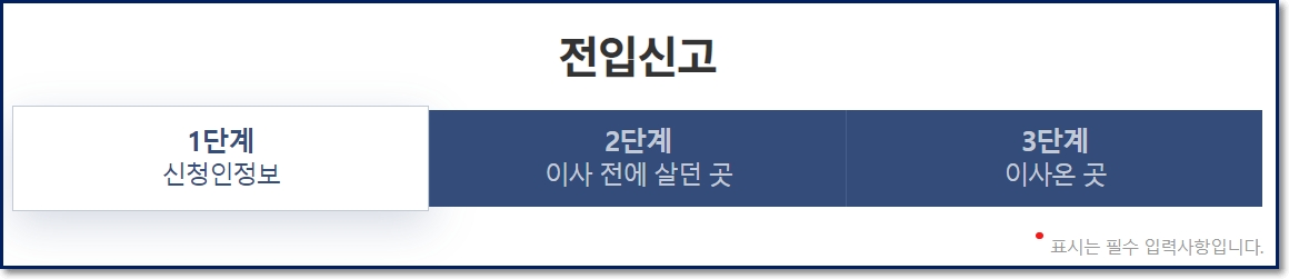 총 3단계에 걸쳐 전입신고 인터넷 절차가 진행됩니다. 1단계로는 전입신고 신청을 하는 신청인의 개인정보를 입력하는 단계입니다.