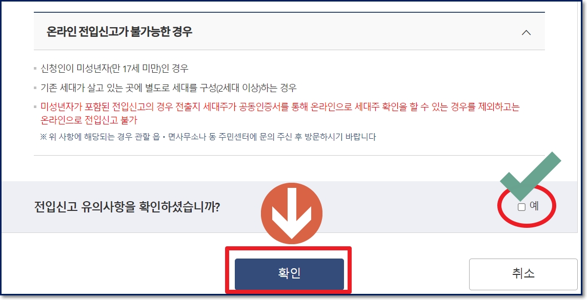 지금까지 전입신고 시 필요서류 및 유의사항을 확인했다면 하단에 확인란에 체크를 하고 '확인'버튼을 누르면 됩니다.