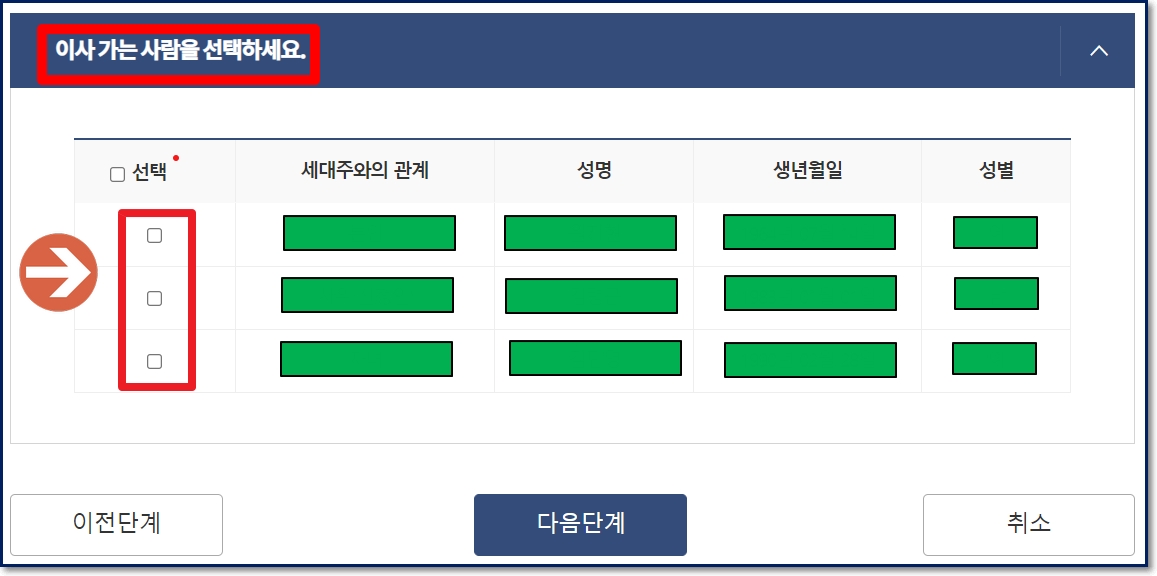 위의 화면에 시도와 시군구를 입력하고 '주소조회'버튼을 누르면 신청인이 살던 곳의 주소가 화면상에 정확하게 나타납니다. 확인 후 '다음 단계' 버튼을 누르면 이전 주소의 세대를 구성하는 구성원의 이름이 나열되는데요. 그 중 본인의 이름을 선택하고 전입신고 신청을 진행하면 됩니다.