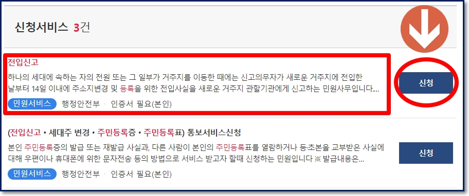신청서비스로 3건이 검색결과에 나타날꺼에요. 3건 중에 '전입신고'라는 제목이 인터넷을 통해 전입신고를 할 수 있는 서비스 항목입니다. 신청 버튼을 바로 눌러도 되고, 전입신고 인터넷 서비스에 대해 더 알아보려는 분들은 빨간 네모를 클릭하면 됩니다.
