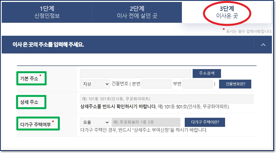 마지막 3단계는 새롭게 이사한 장소, 즉 새주소를 입력하고 새로운 세대의 구성 정보를 입력하는 단계입니다. 우선 해야할 일은 새로운 거주지의 상세 주소를 입력하고 다가구 주택여부를 입력해야 합니다.