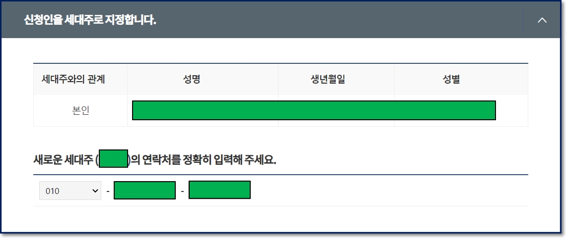반면, 기존의 세대주가 있는 곳으로 전입신고 인터넷신청을 하는 분들은 새 세대주의 확인절차를 거쳐야 합니다. 세대주의 개인정보를 입력하고 세대주와 신청인의 관계를 입력해야 절차가 마무리 됩니다.