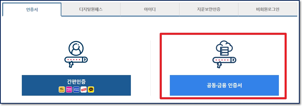 회원신청하기를 누르면 간단한 회원가입 과정을 거치고 인증과정으로 넘어갑니다. 저는 자주 애용하는 인증방법으로 공동인증서나 금융인증서를 사용합니다. 저는 회원가입을 이전에 접속했을 때 모두 마무리했기에 이번에는 간단히 인증서만 확인하고 로그인이 가능합니다.